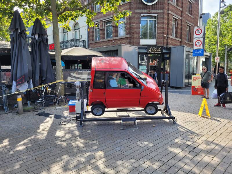 Ook bij Canta LX, een wagentje dat doorgaans maximaal 45 kilometer mag rijden, is er een uitnodiging om in te stappen. Een man houdt het portier open, sluit de veiligheidsgordels, net als bij een kermisattractie. In wezen lijkt het daar ook op.