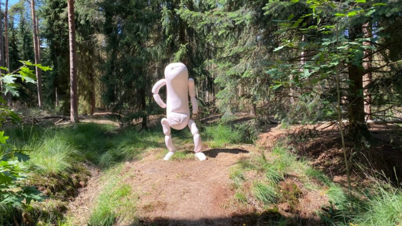 Erwin Wurm uit Oostenrijk spant de kroon. Zijn bronzen figuur lijkt op een worstman (armen van worstjes, benen van worstjes, een lijf in de vorm van een worst). Het werkt op de lachspieren. Die worstman staat pontificaal in het bos. Je kunt niet om hem heen.