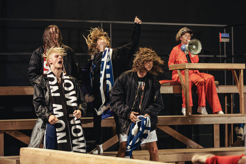 Ook als de spelers na de strijd een lied zingen, een soort van volkslied, roept dat vragen op. Is het de toewijding die Miet Warlop bevraagd? Toewijding aan de ander, aan een groep, aan een land, om tegelijkertijd het persoonlijke belang te vergeten en jezelf de vernieling in te helpen.