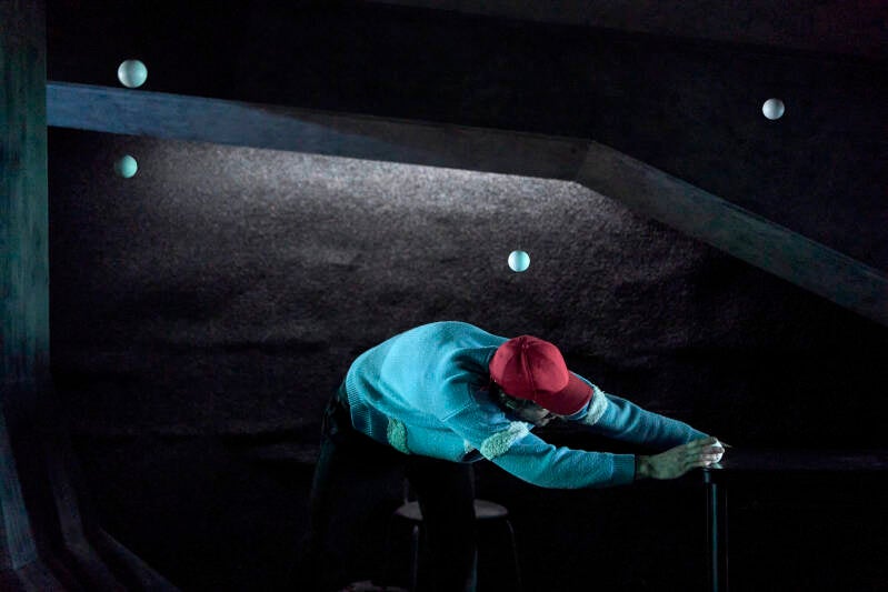In het begin van het de voorstelling liggen die balletjes nog verspreid over de vloer. Stijn Gruppe, met petje en jasje, heeft een stofzuigerslang in zijn hand, zuigt de balletjes op en deponeert ze in een kist die op de vloer staat. In die kist vallen de ballen onmiddellijk stil, stuiteren doen ze niet.