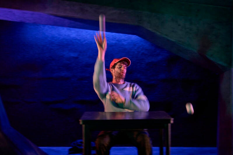 n de grot staan een tafeltje met een stoel. Als Stijn Gruppin achter de tafel gaat zitten, werpt hij de balletjes weg, waarna die als een soort boemerang terugkeren. Ze stuiteren op het tafelblad en draaien meerdere keren om de poten van de tafel. Het lijken balletjes met een sterke eigen wil die de zwaartekracht tarten en hun eigen koers bepalen.