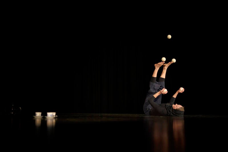 De opbouw van ‘Ballroom’ is tamelijk traag, maar langzaam ontpopt zich een enerverend spektakel dat de hersenen niet kunnen bevatten. Schijnbaar achteloos raapt de jongleur een balletje van de grond, gooit die tegen de wand, waarna die bal via een andere wand terugkaatst en in de kist belandt. De eerste keer legt zo’n bal een gemakkelijk parcours af, maar de weg naar de krat wordt bij elke nieuwe bal ingewikkelder. De bal kaatst van wand naar wand, dan tegen een pilaar en valt na een carambole n de kist.